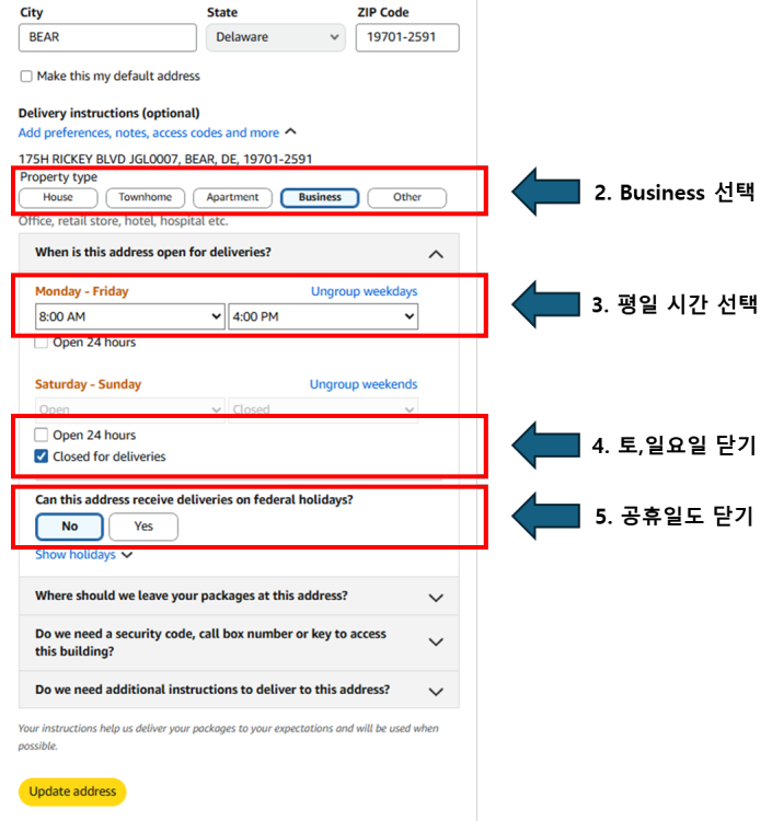 현지 창고 택배 관련 분실/도난 관련 공지 안녕하세요, 정군로지스틱스입니다. 최근 델라웨어(DE) 창고에서 도난·분실 사고가 빈번하게 발생하고 있어 안내드립니다. *타 지역도 고가의 제품, 리스크가 있는 제품은 신경써주시면 좋습니다. 사장님들의 안전한 배송을 위해 아래 내용을 반드시 확인해 주세요. 1. 창고 담당자 직접 수령 이외 경우에 대한 보상 불가 안내 현지 판매처로부터 제품이 배송될 때, 창고 담당자가 직접 수령하지 않는 모든 경우에 대해서 생기는 분실, 보상 등은 보상이 되지 않습니다. ※ 참고 - 미국 델라웨어 창고의 작업시간은 평일 오전 8시~오후4시입니다. 해외 판매처에서 결제 시, 작업 시간 내 도착하도록 주문해주세요. 2. 델라웨어 지역 특성 안내 델라웨어는 미국 내에서도 도난 사고 발생률이 높은 지역입니다. 배송대행지를 이용하실 때 이 점을 반드시 인지하시고, 고가 상품 주문 시 각별한 주의를 부탁드립니다. 3. 아마존 주문 시 배송시간 설정 방법 아마존은 배송일 지정이 가능하므로(하단의 이미지 참조), 작업 시간 외 배송(토/일 도착)이 되지 않도록 설정해 주세요. 불가피하게 주말 도착 예정일이 잡힌 경우, 판매처에 문의하여 주문 취소 또는 배송일 변경을 권장드립니다. |