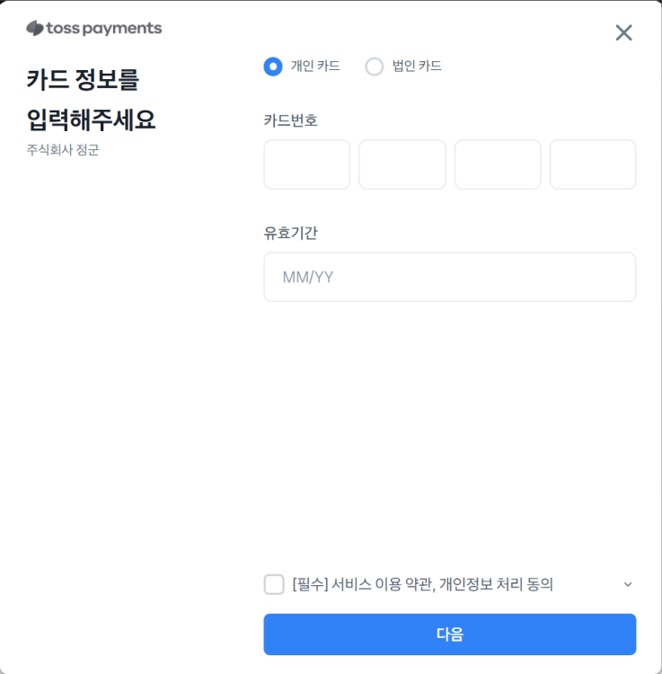 < 카드 등록 화면 > 해당 페이지에서 카드 번호 및 유효기간을 입력 후 [ 다음 ] 버튼을 누르면 본인 정보 확인 란이 나오게 됩니다.