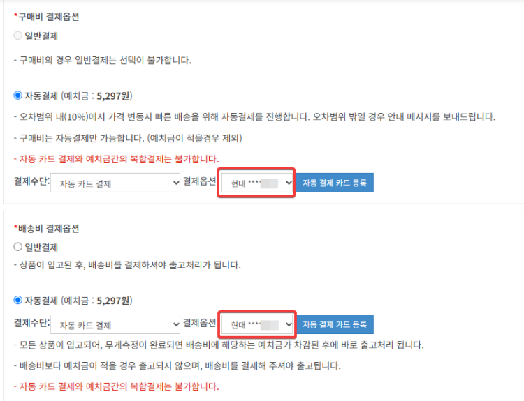 [ 등록 카드 정보 ]에서는 메인 카드를 설정하여, 가장 기본적으로 결제가 되는 카드를 선택하거나 카드정보를 삭제할 수 있습니다. ⚠️ 주의사항 1. 자동 카드 결제와 예치금간의 복합 결제는 불가합니다. 2. 면세구매대행(결제대행) 신청서 작성 시, 결제수단이 등록된 카드로의 자동 결제일 경우에는 구매비 결제가 완료되거나 취소, 삭제되기 전까지는 등록된 카드 삭제가 불가합니다. |